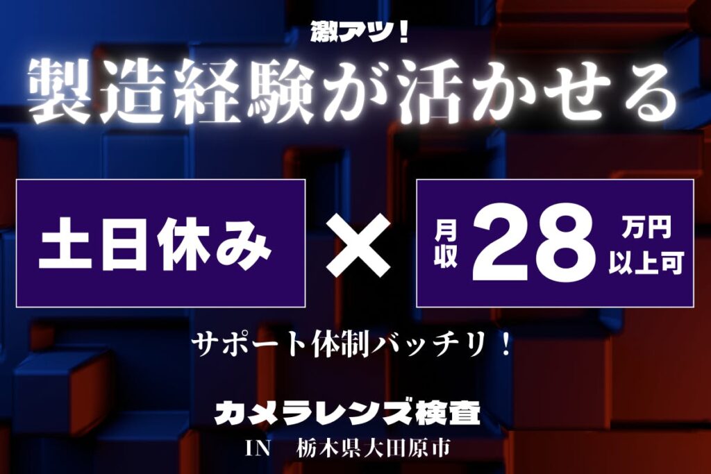 \正社員登用実績あり!/【西那須野駅から車で10分】無料駐車場完備◎土日休み・月28万以上可◎カメラ用レンズの製造:機械操作・検査スタッフ<大田原市> utm138-2-99